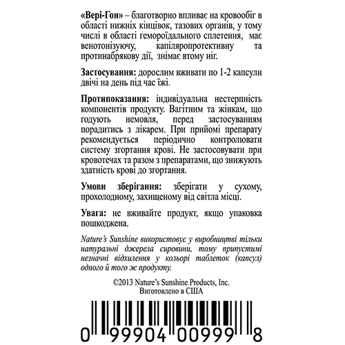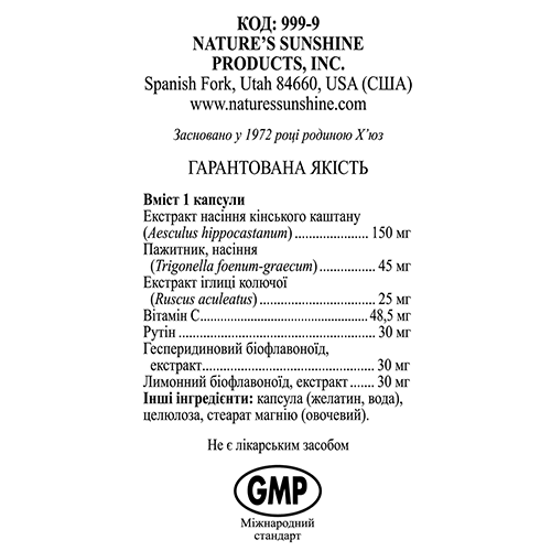 Состав (1 капсула):Экстракт из семян конского каштана стандартизирован - 20% эсцина - 150 мг.Экстракт из корней иглицы шипованой стандартизирован - 8,5% рускогенина - 25 мг.Витамин С - 48,5 мг.Рутин - 100 мг. Гесперидин - 100 мг. Лимонный биофлавоноид - 100 мг.